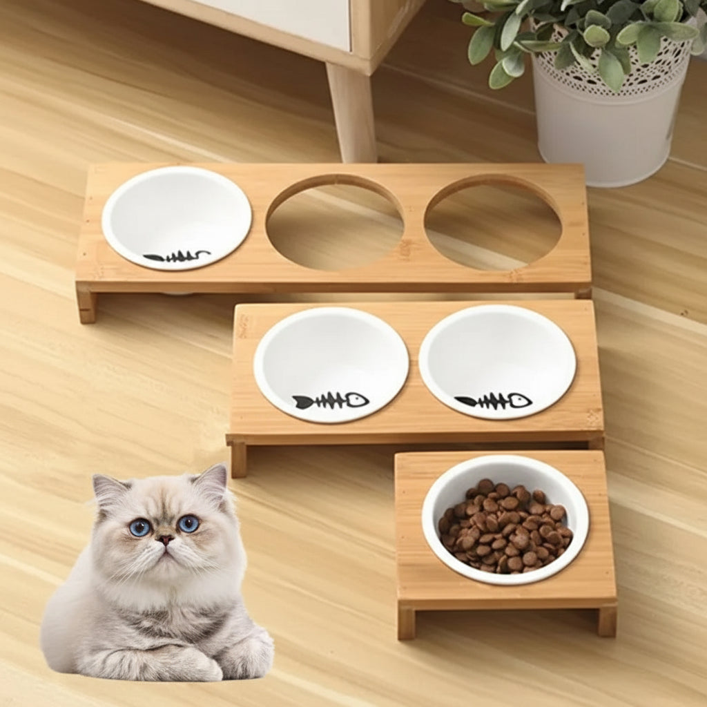 Keramik Futternapf mit Holzständer – Erhöhter Katzen- und Hundenapf (Einzeln, Doppel, Dreifach)